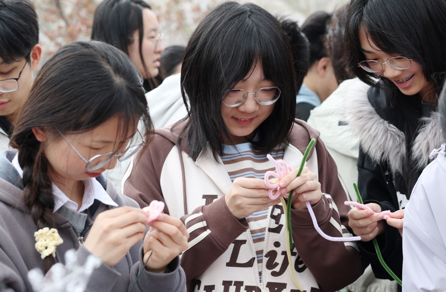 学天真手编织“樱花”。