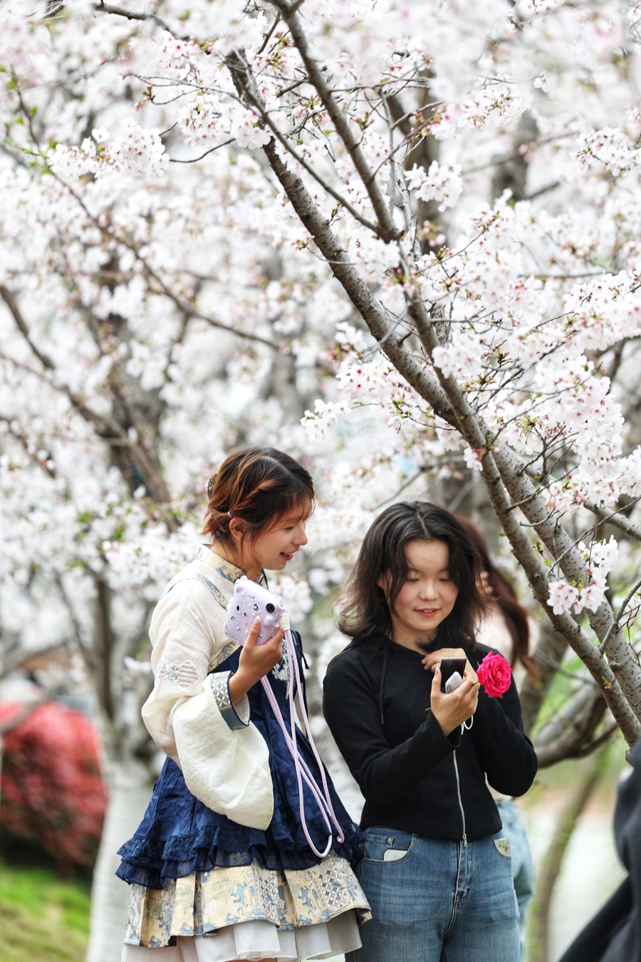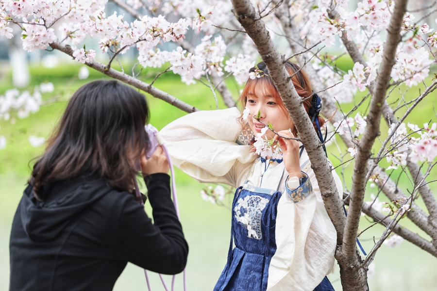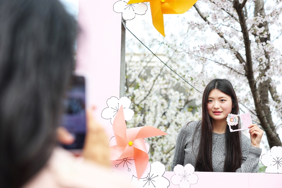 学生在樱花树下留影。
