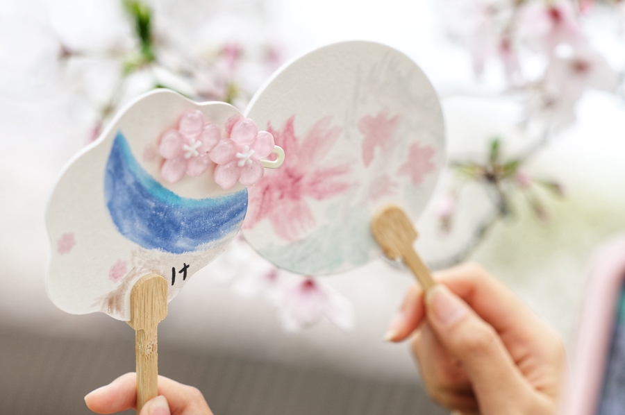 学生在樱花树下绘图的扇面。