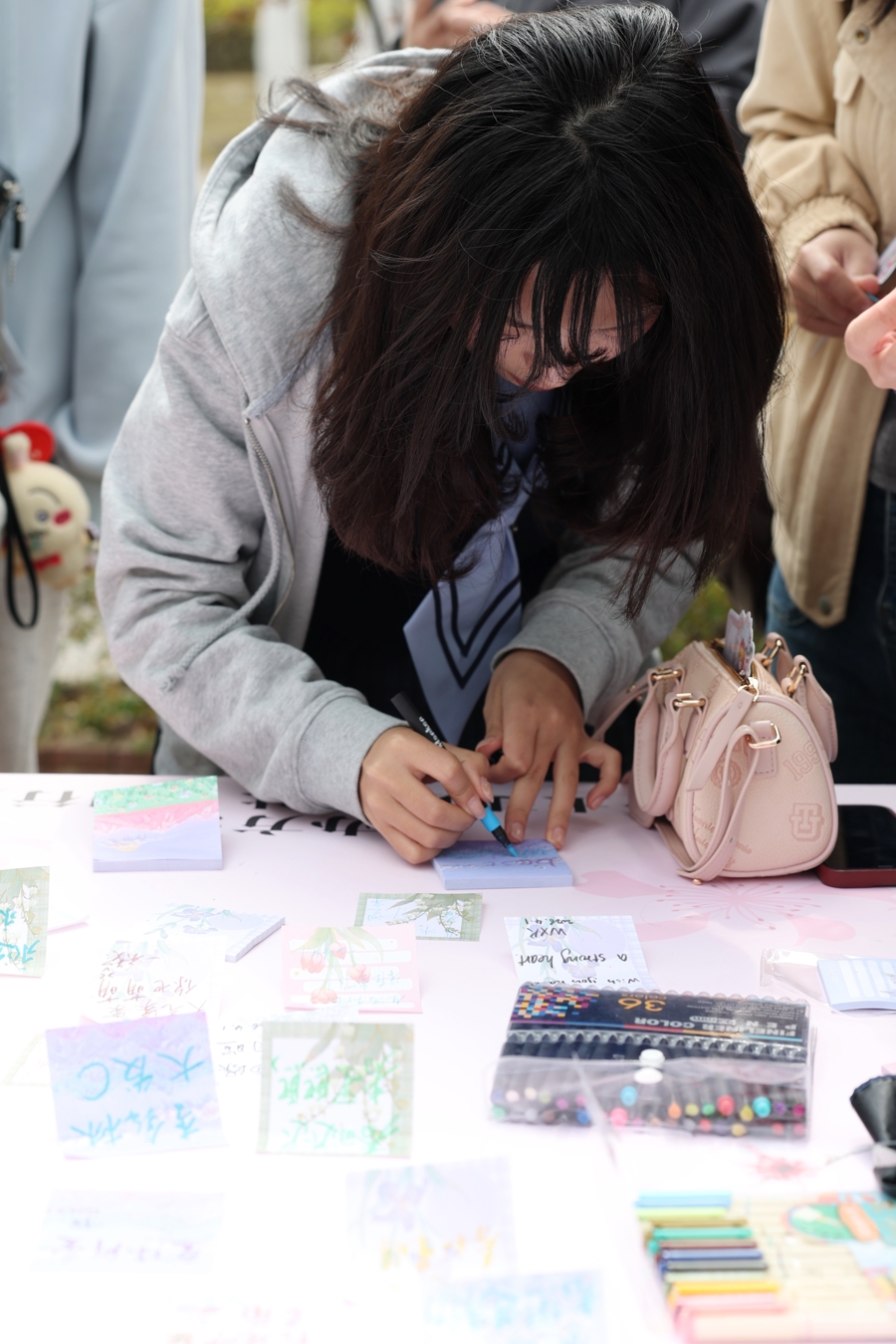 又名女生在樱花神色涂鸦板上画神色包。