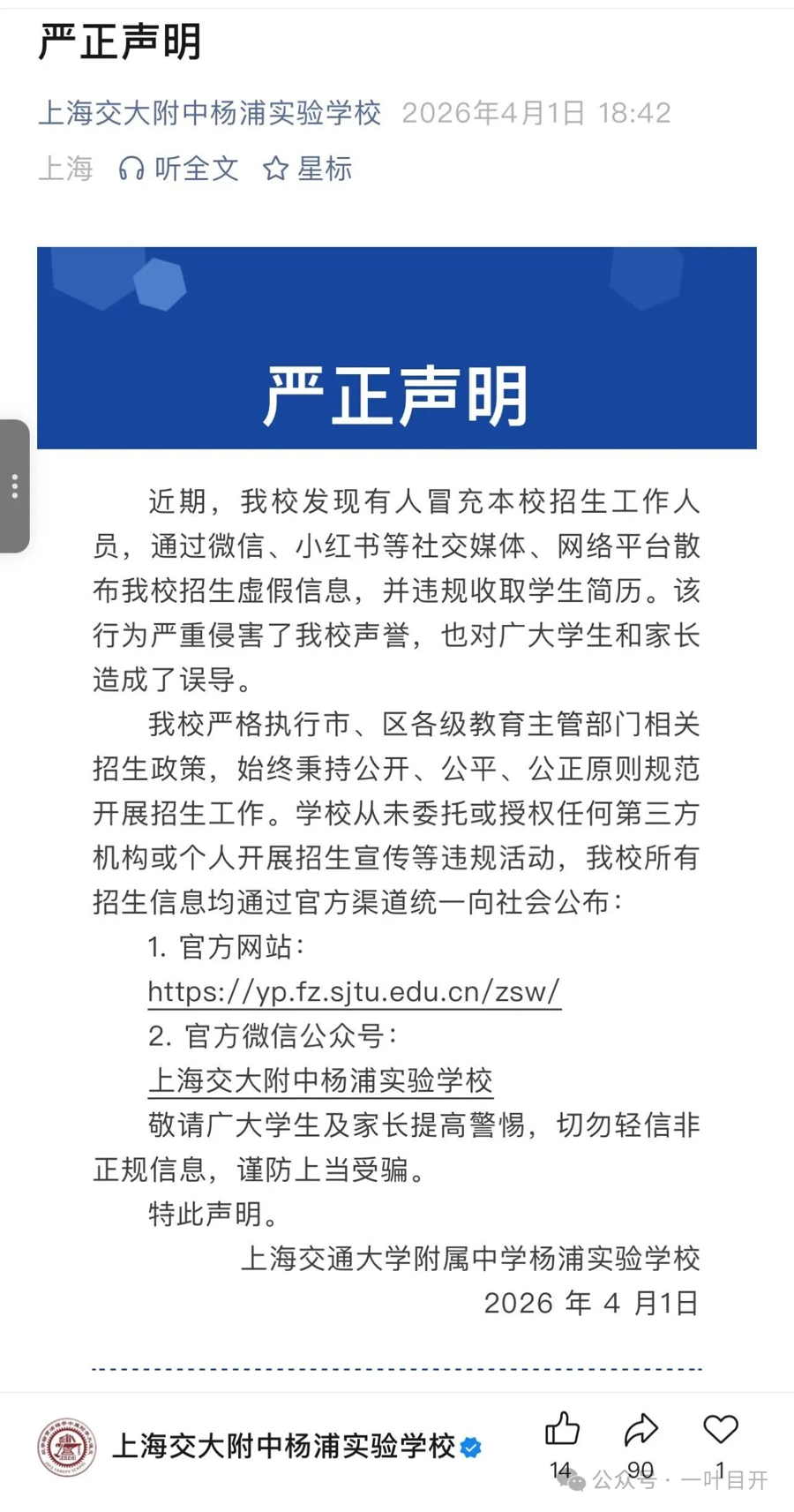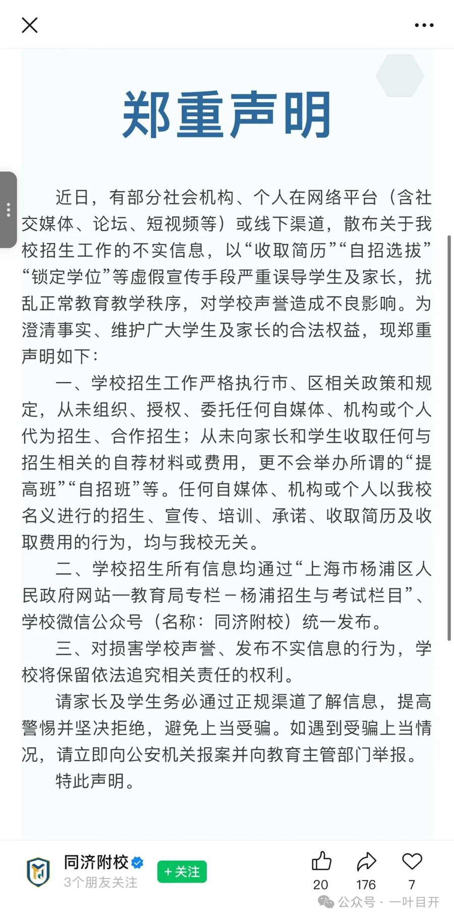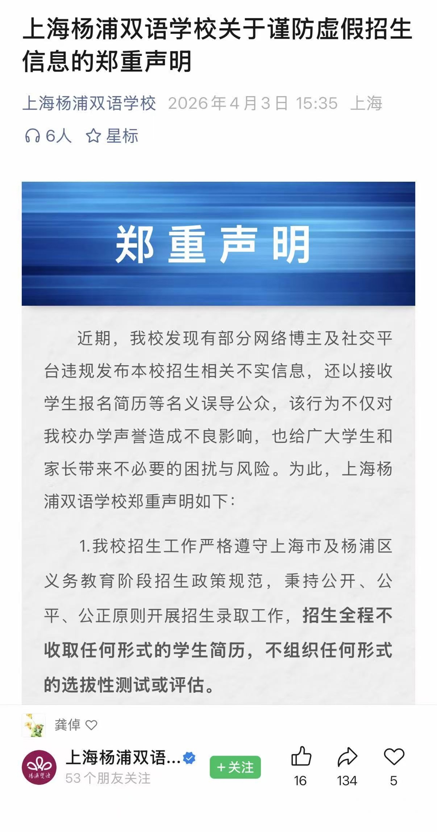 值得护理的是,上周,上海交通大学从属中学杨浦实验学校、上海杨浦双语学校、同济大学从属新江湾城实验学校等纷繁发布声明,辟谣提前招生、里面采选、收取简历等伪善信息,强调将严格顺从阳光招生策略。