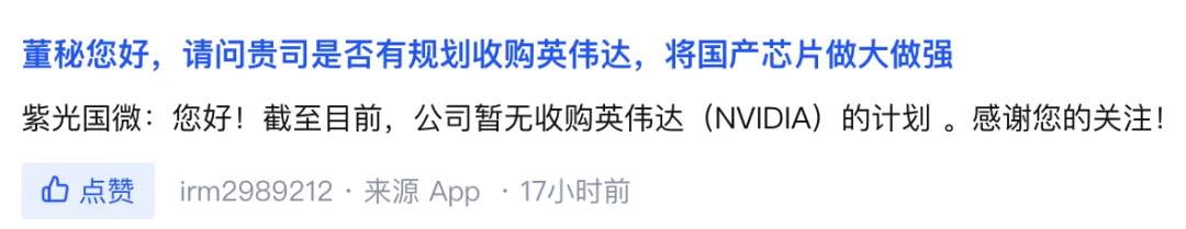 近期,有投资者向紫光国微抛出一个大胆提问:请问贵司是否有规划收购英伟达,将国产芯片做大做强?