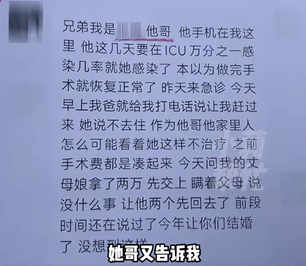 没过多久,又名自称女方的哥哥关系王先生,称女方因为眼睛的手术住进了ICU,王先生又凑了20万转了以前。