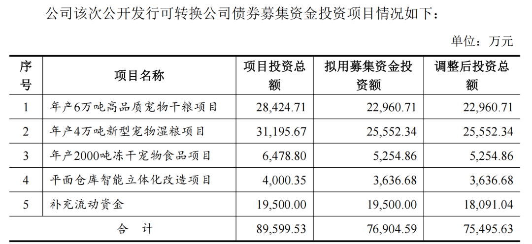 中宠股份公告泄露,公司于2022年10月公开采行769万张可退换公司债券,执行召募资金净额7.55亿元,用于多个宠物食物分娩线成就及补充流动资金。