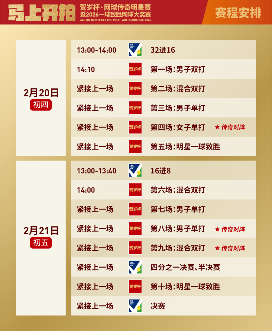 贺岁杯的前两个比赛日,2026年一球致胜网球大奖赛将率先打响。赛事自2月18日开始,将于2月21日现场揭晓冠军头衔及100万元(含税)冠军奖金归属。诞生于2020年的一球致胜网球大奖赛,是一场属于网球爱好者的激情狂欢。通过一球定胜负、毫厘见真章的对决方式,让参与者乐在其中,让观赛者屏息期待;赛制兼顾实力与运气,强调机会均等与性别平衡,诠释了“人人皆可成为英雄”的体育梦想。