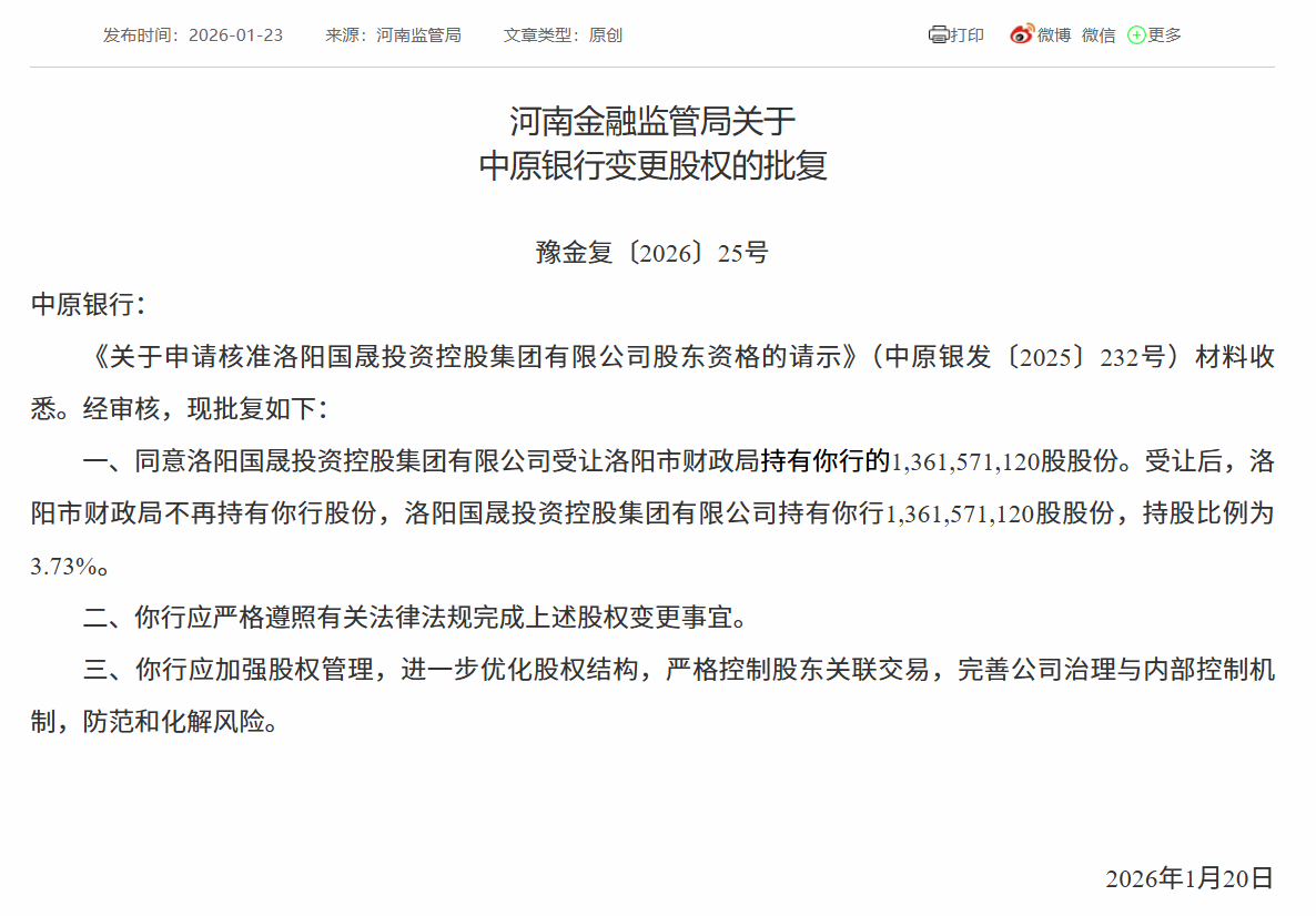 安联配资 中原银行股权变动获批 洛阳市财政局退出股东行列