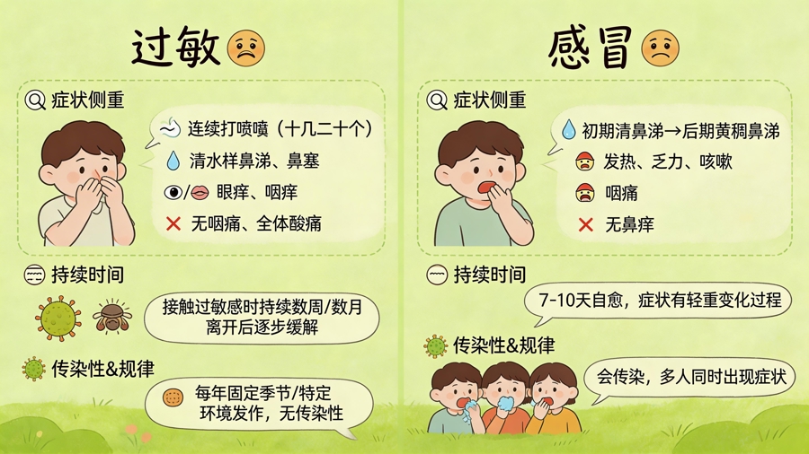 上海中医药大学从属岳阳中西医联结病院呼吸内科刘春芳副主任医师讲授,分离过敏照旧伤风,当先要看症状的“侧重心”——过敏症状侧重于“鼻痒”,相通过敏东谈主群遇上过敏原时会纠合打喷嚏,甚而多达十几二十个,并流大齐净水样鼻涕,伴有鼻塞、眼睛痒或咽痒等,但不会出现喉咙痛或全身酸痛的症状;伤风的症状是由“病程”决定的,伤风初期会出现鼻流清涕,鼻塞喷嚏,到了后期可能会出现鼻流黄稠涕,伤风相通时也会伴有发烧、咽痛、咳嗽、乏力等,但一般不出现鼻痒的症状。